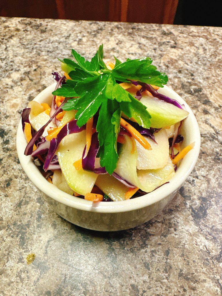 7. Add squash, apple, cabbage, carrots and all but a few pieces of parsley. Use your hands to gently toss everything in the dressing.