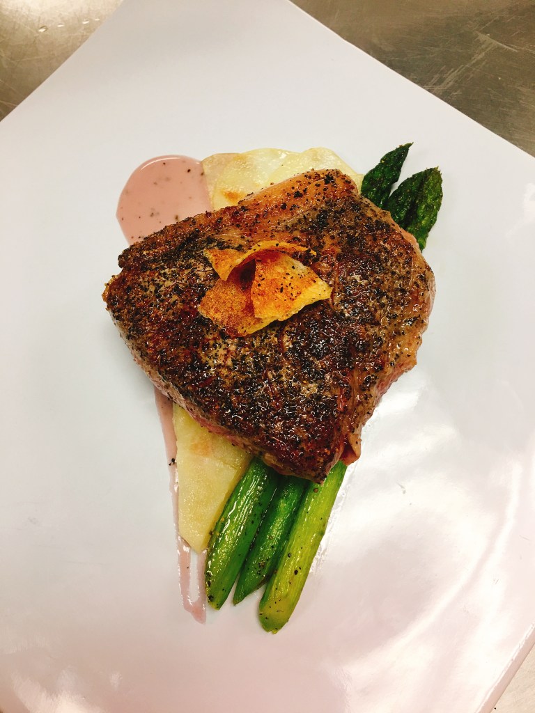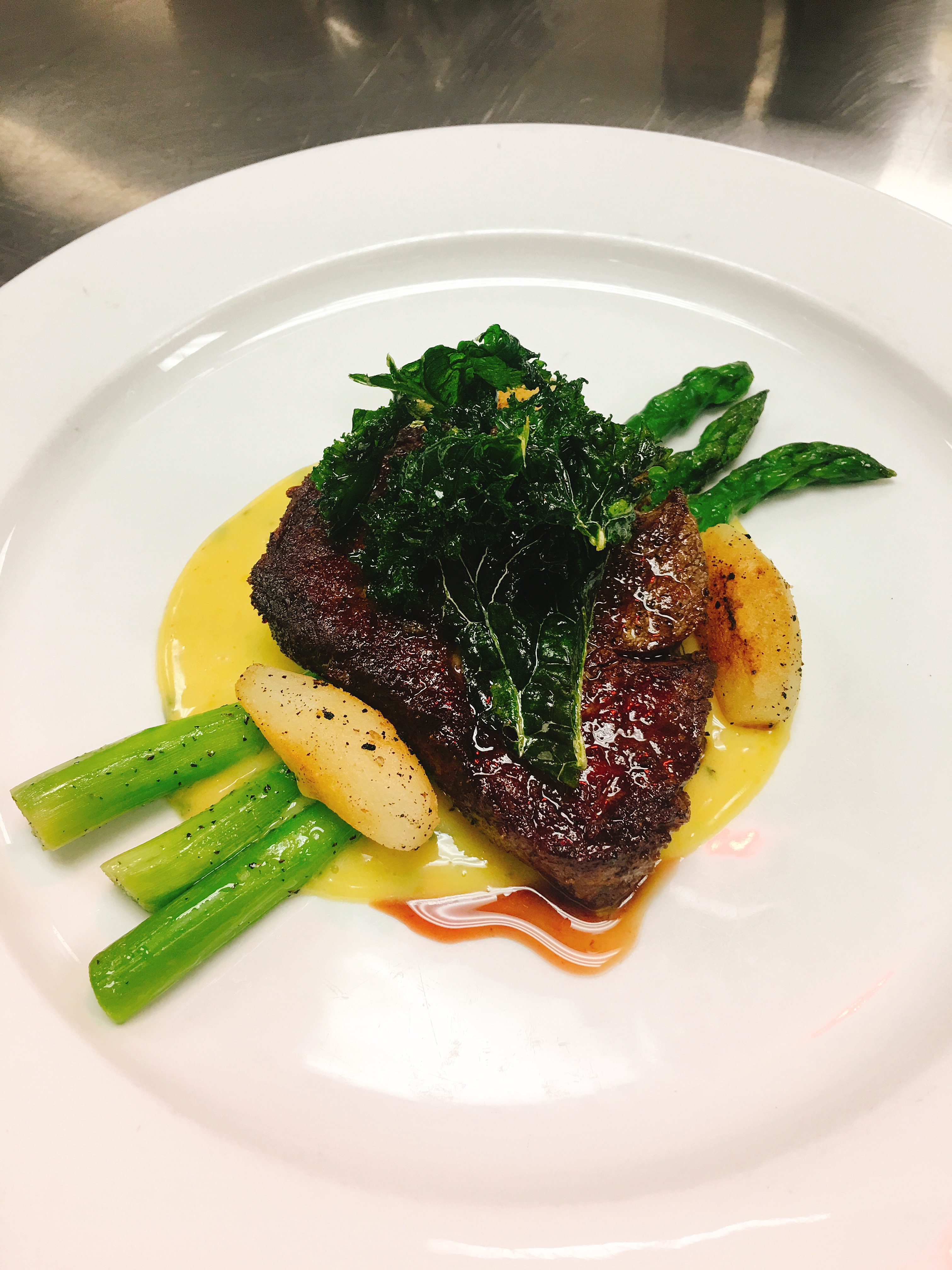 New York Strip Steak w/ Pommes Anna, Buerre Rouge, & Asparagus (College)