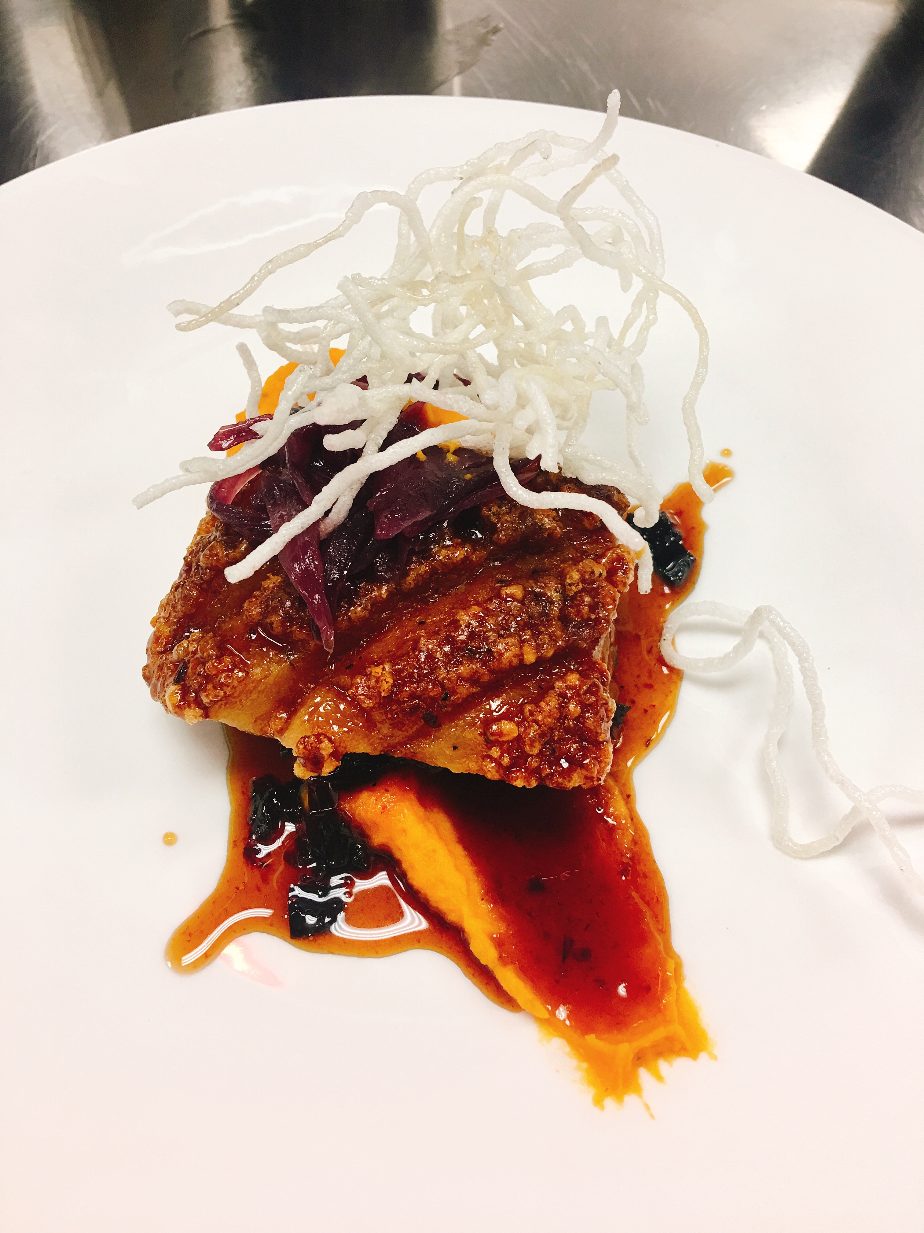 Pork Belly w/ Ancho Maple Glaze, Sweet Potato Purée, & Red Onion Confit (College)