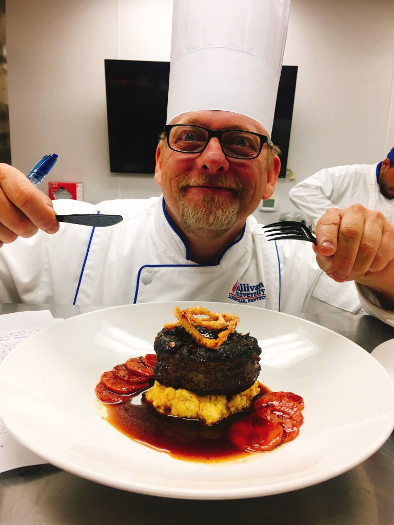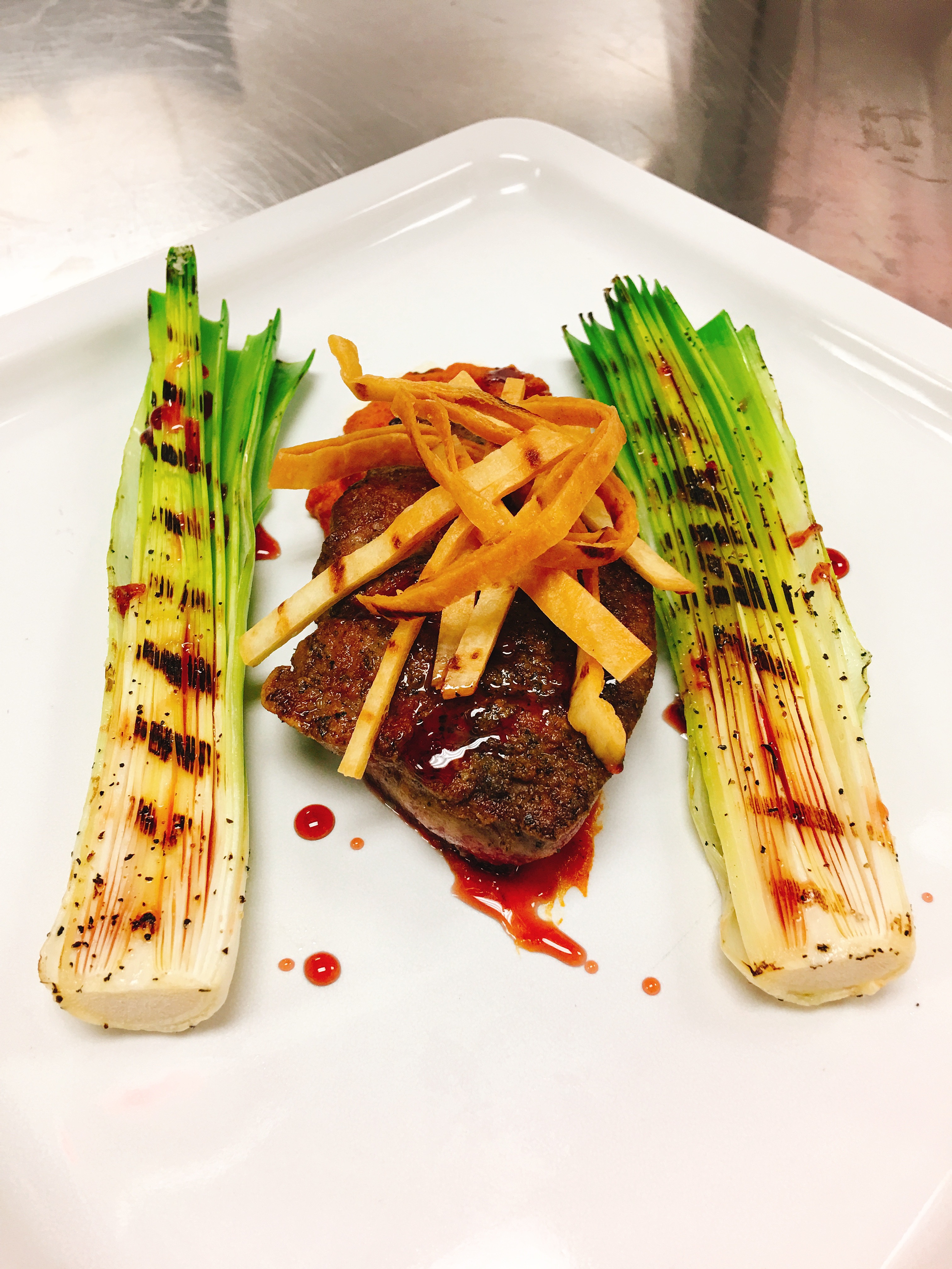 Seared Liver w/ Sweet Chili Sweet Potatoes, Grilled Leeks, & Cherry Bourbon Sauce (College)