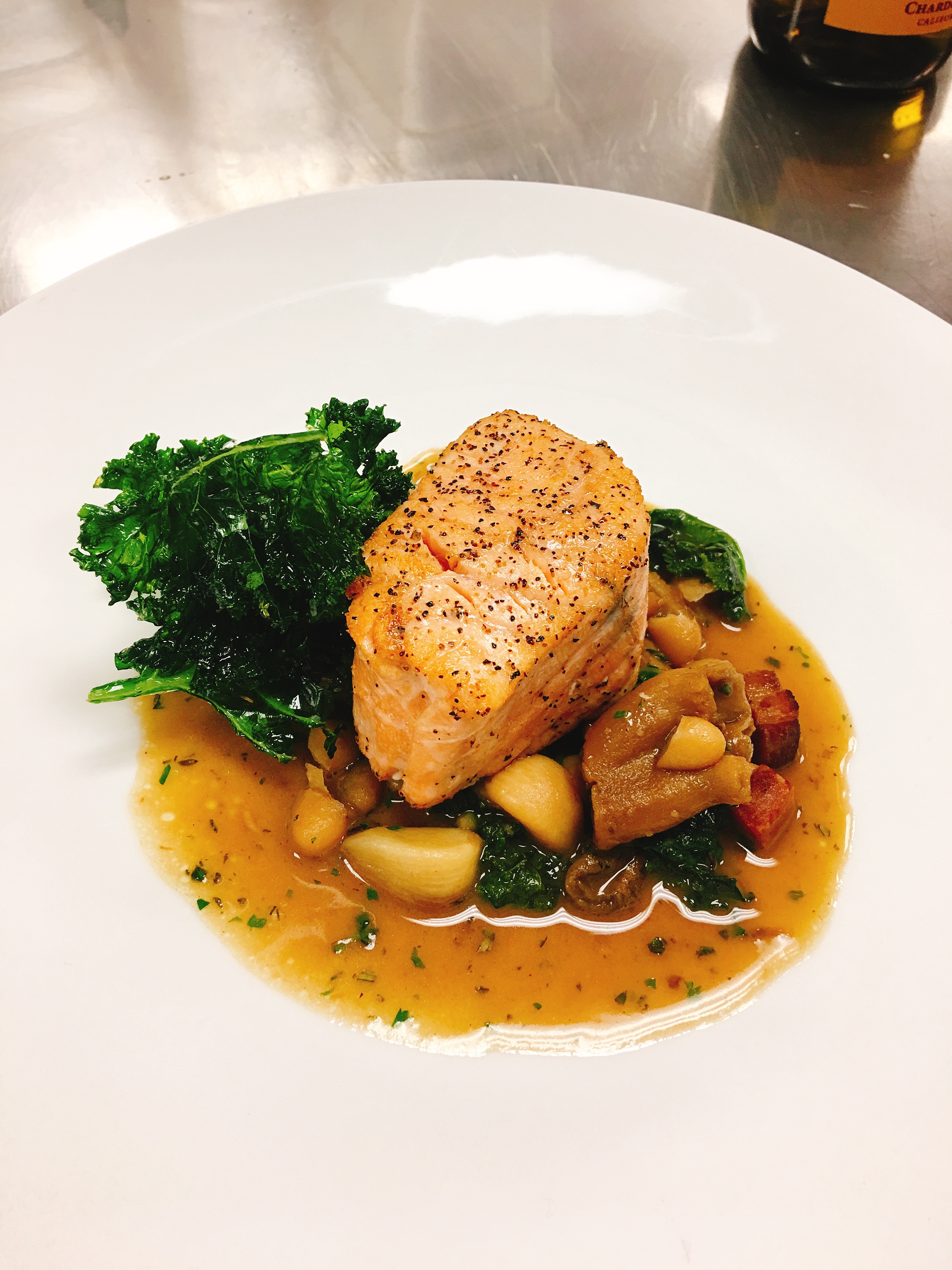Salmon w/ Roasted Garlic, Wild Mushroom, & White Bean Ragout Sauce. (College)