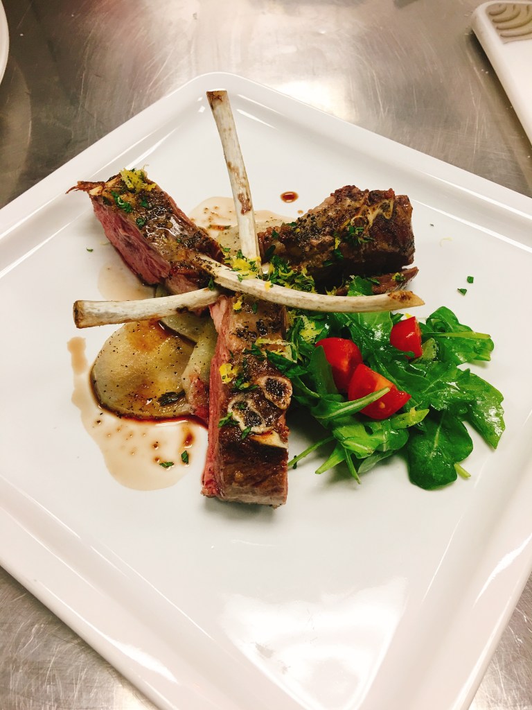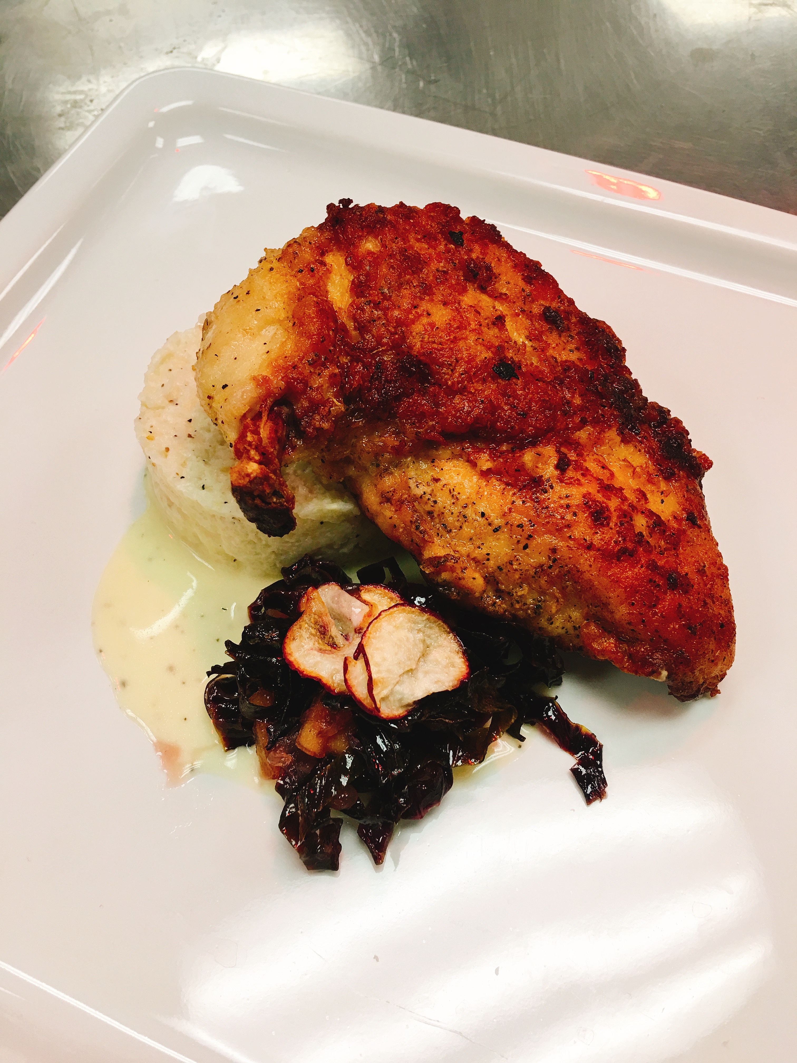 Airline Chicken w/ Goat Cheese Grits, Apple Bacon Cabbage, & Beurre Blanc (College)