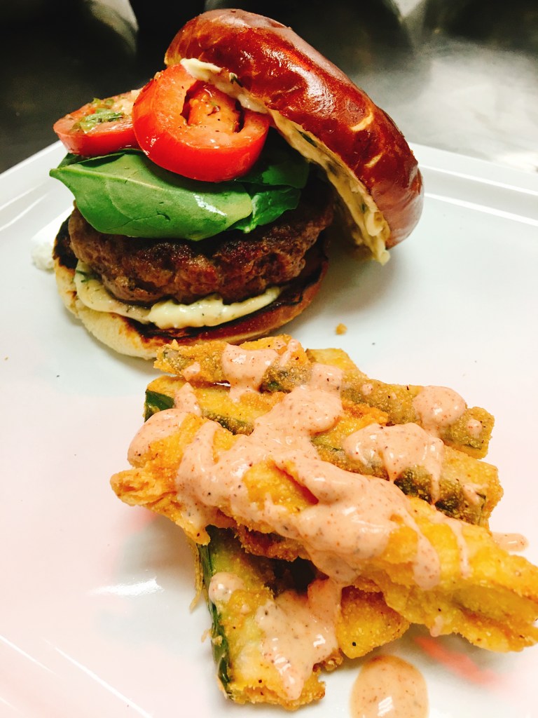 Greek Lamb Burger w/ Fried Cucumbers & Chipotle Lime Sauce (College)